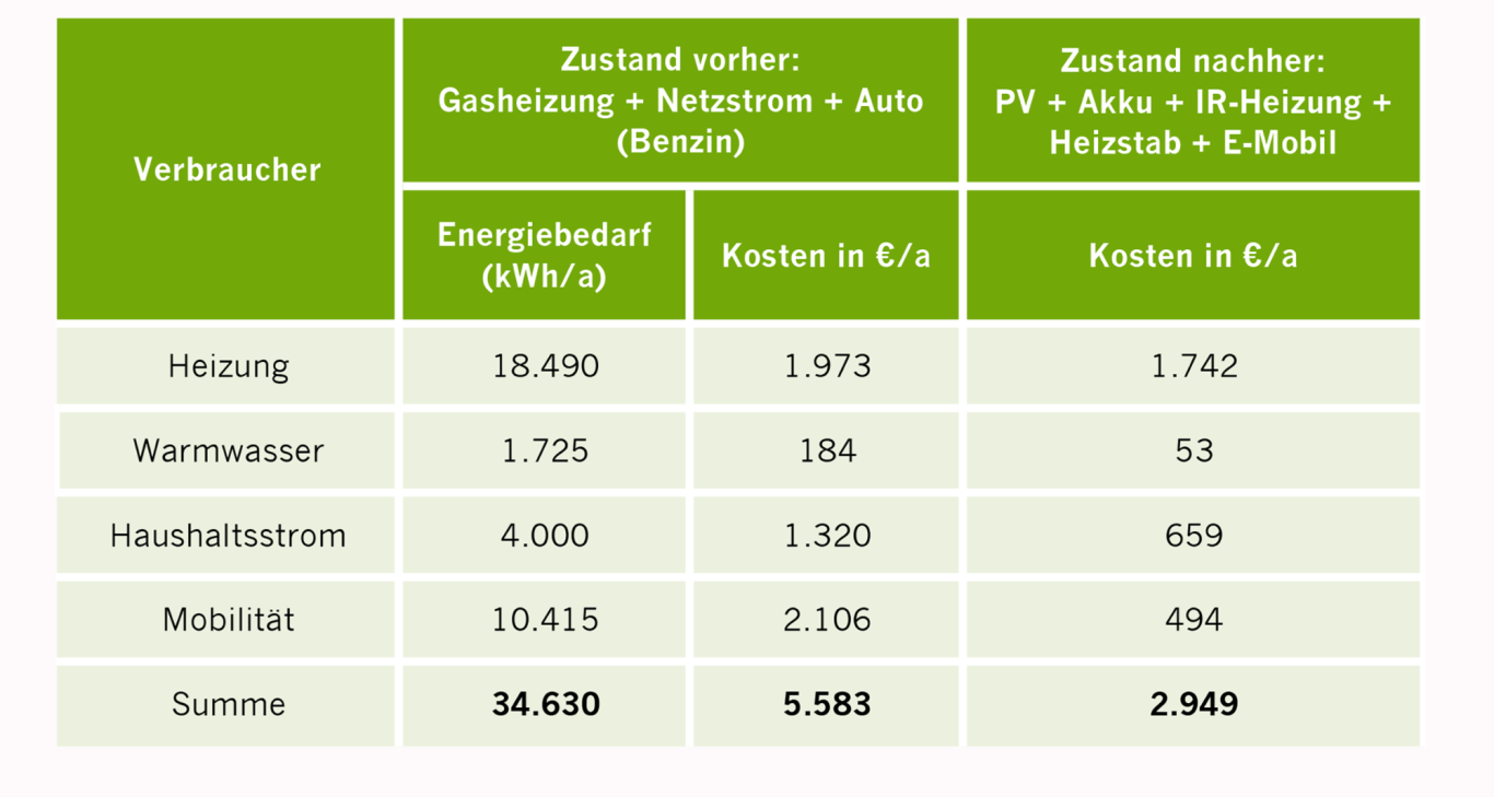 Mit einer 10 kWP-PV-Anlage, 10 kWh Batterie und einer Ladestation kann ein großer Teil der Energiekosten für Haushaltstrom, Warmwasser- und Heizung sowie Mobilität eingespart werden.